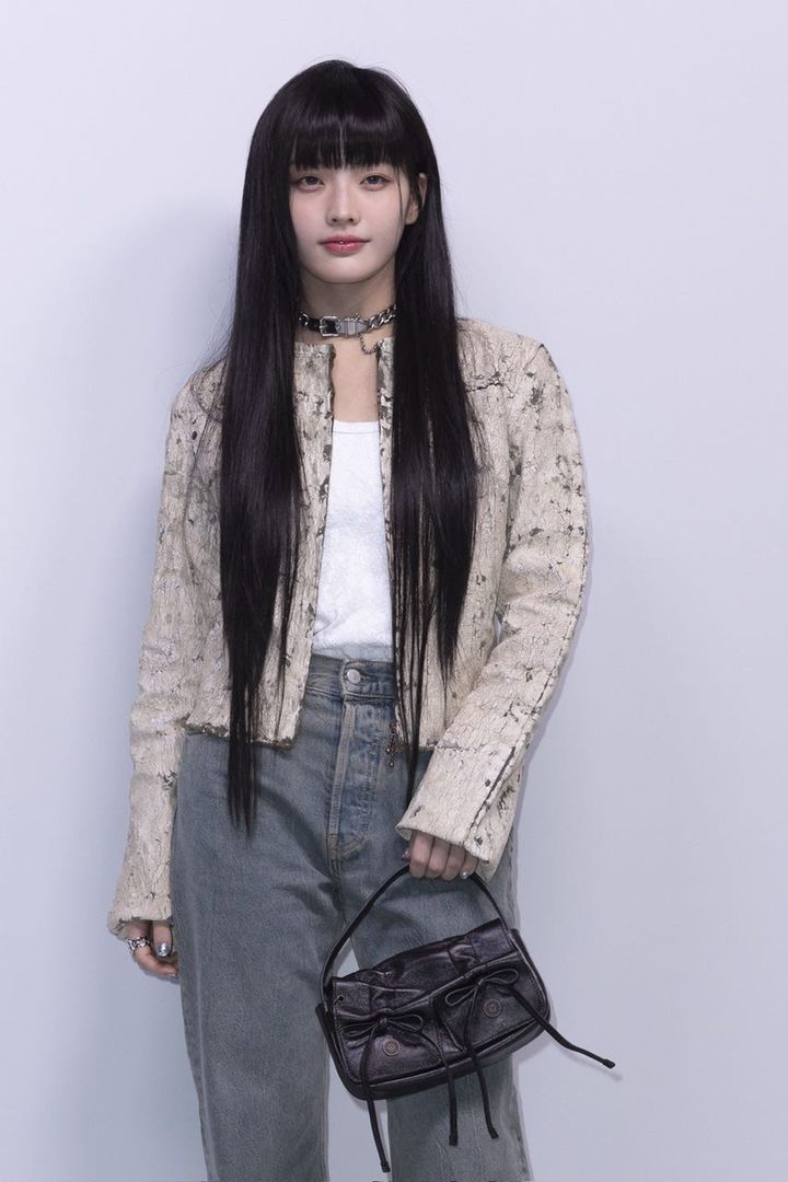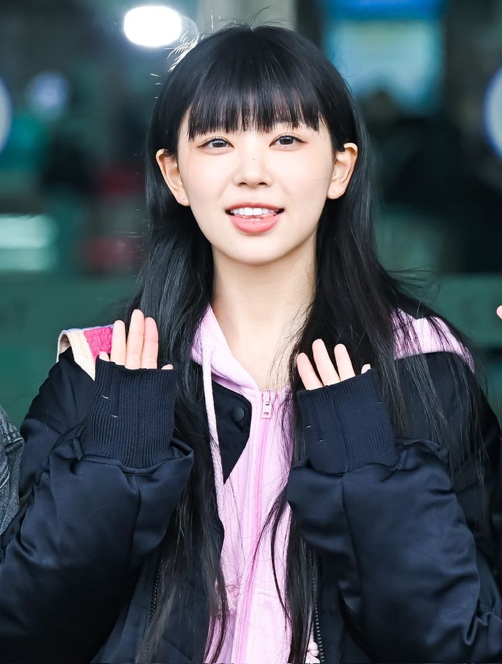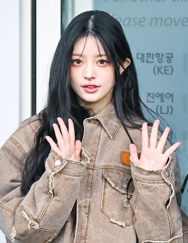 ファッションウィークに参加するため、パリに向けて出国するILIITメンバー。高め位置のポニーテールで登場したユナは、黒髪ながらも眉を脱色したことで、明るく今っぽいムードに。