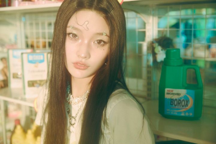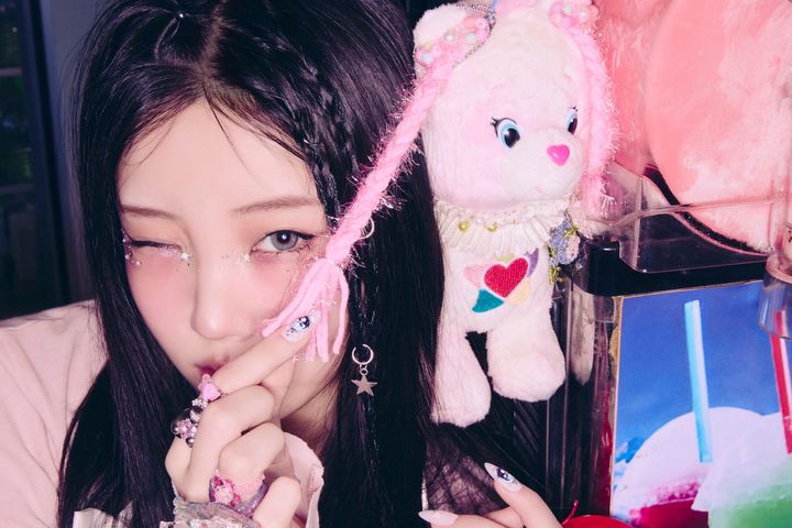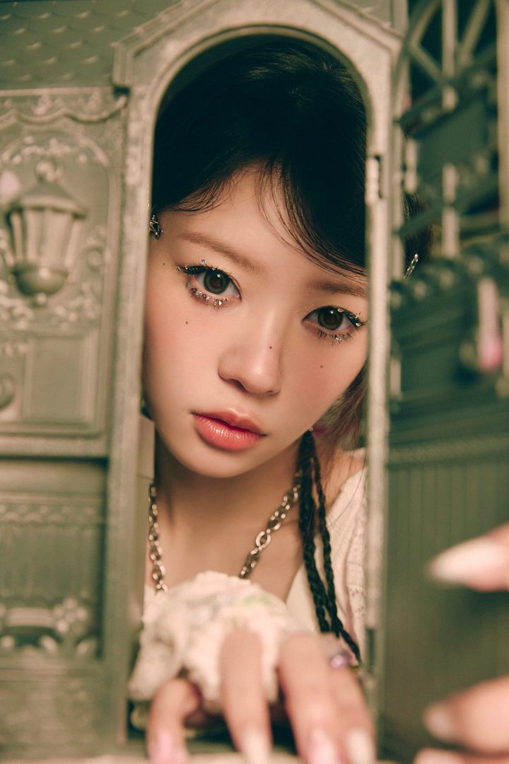 ミンジュはツインテールにティアラを合わせて、まるでセーラームーンのようなファンタジックなビジュアルに変身。メイクはあえてマットな質感に仕上げることで、現実離れした雰囲気を引き立てて。