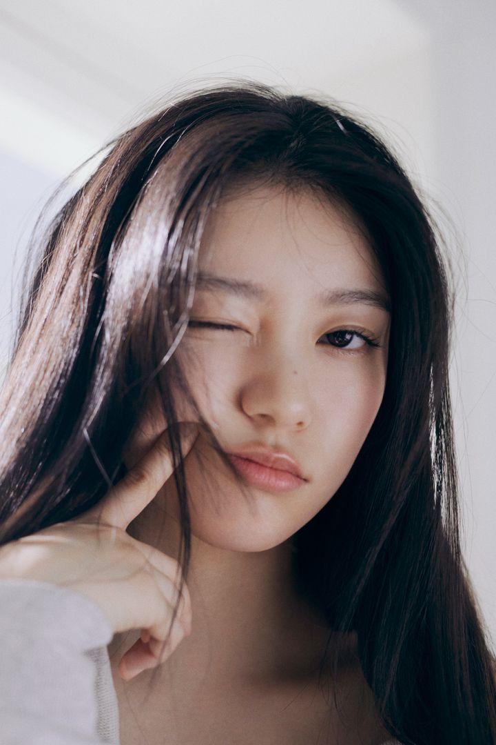 ナチュラルな黒髪ロングに白シャツを合わせ、学生のような清純なビジュアルを披露したウォンヒ。メイクはとことんシンプルに仕上げることで、透明感を最大限に引き出すことに成功。