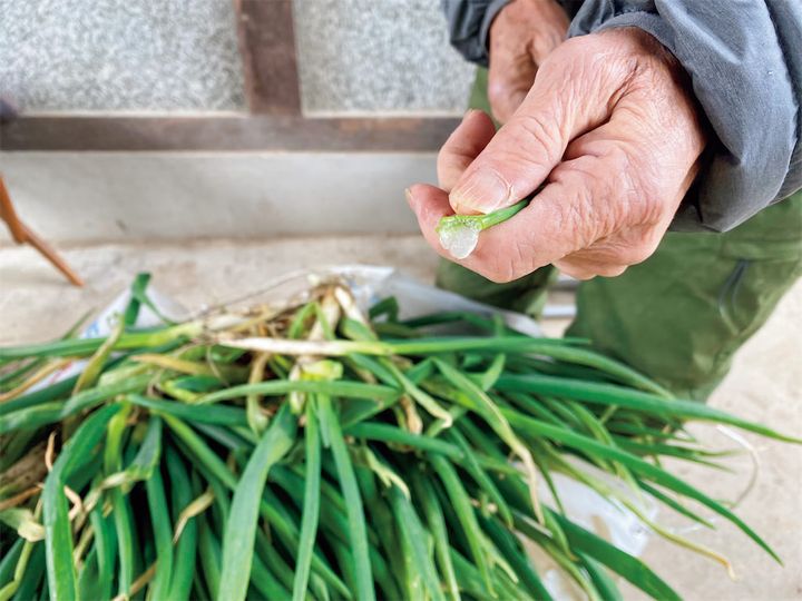 これは葉の内部に蓄えた甘い汁がしみ出てくるもので、手に取ってなめると甘い。昼には蒸発して消えてしまうが、ネギの糖度が十分に高まったことを表す現象だという。安里さん夫婦は、一日に二百束(一束二百グラム)の収穫と出荷作業を続ける。
