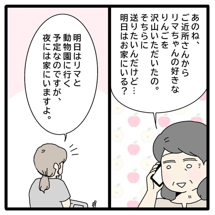 「あのね、ご近所さんからリマちゃんの好きなりんごを沢山いただいたの。そちらに送りたいんだけど・・明日はお家にいる?」と聞かれたので、「明日はリマと動物園に行く予定なのですが、夜には家にいますよ」と答えました。