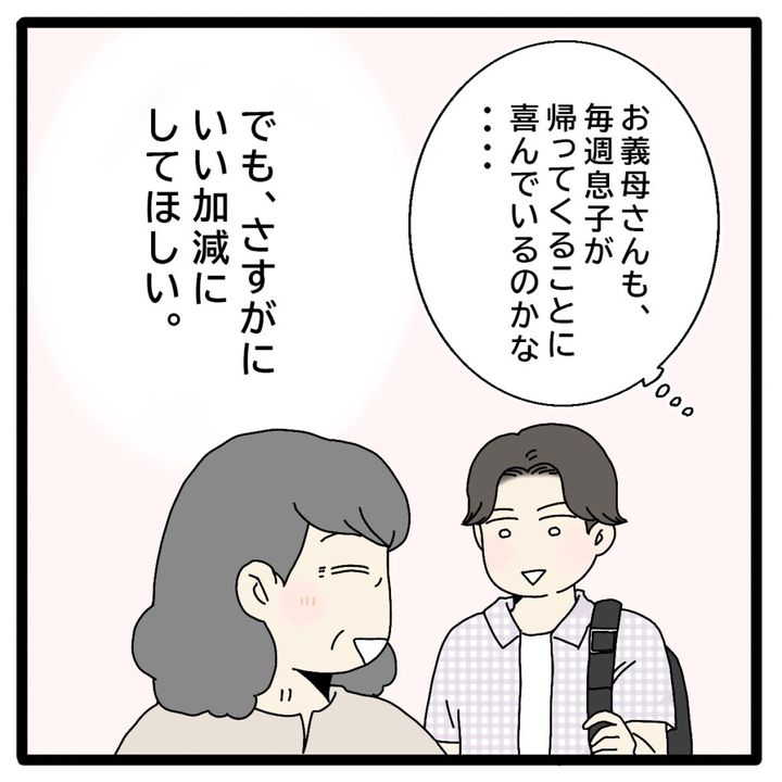 お義母さんも、毎週息子が帰ってくることに喜んでいるのかな・・。でも、さすがにいい加減にしてほしい。