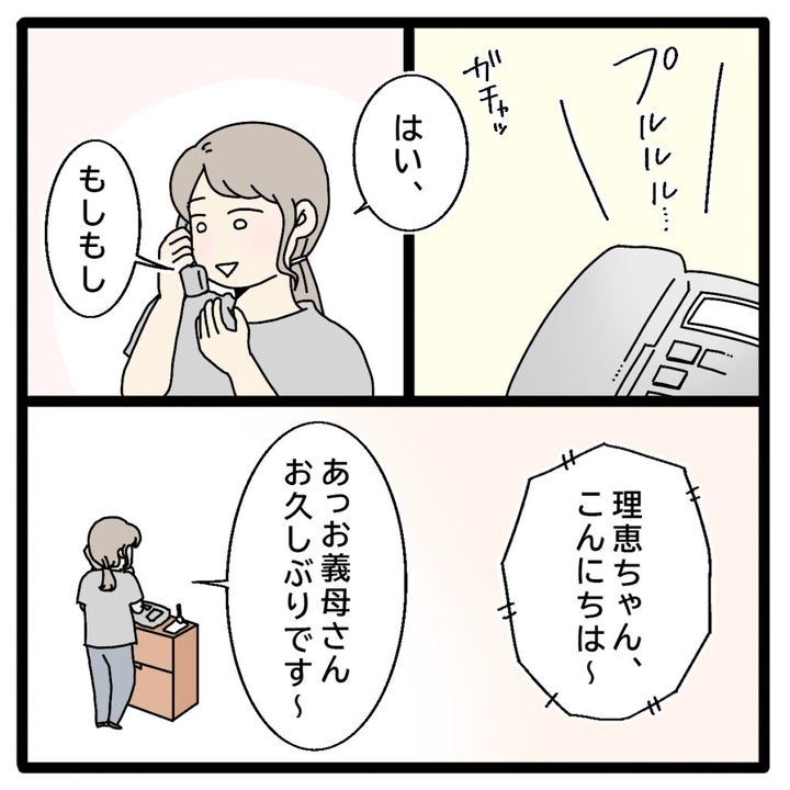 すると、家の電話が鳴りました。出ると、「理恵ちゃん、こんにちは~」と義母の明るい声。「あっ、お義母さん、お久しぶりです~」と挨拶すると、