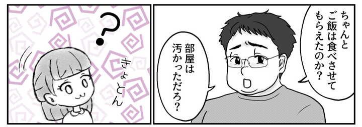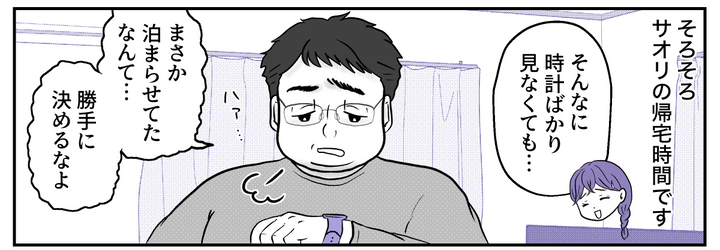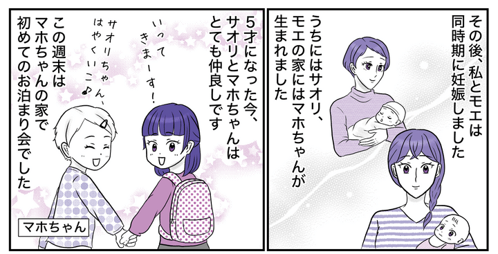 モエの一家は、最近地元に戻ってきました。うちの近所に住んでいて、サオリとマホちゃんは同い年のイトコ同士とても仲良しです。この週末は初めてのお泊まりでした。ハルキがソワソワしていると、モエに送り届けてもらったサオリが帰ってきました。