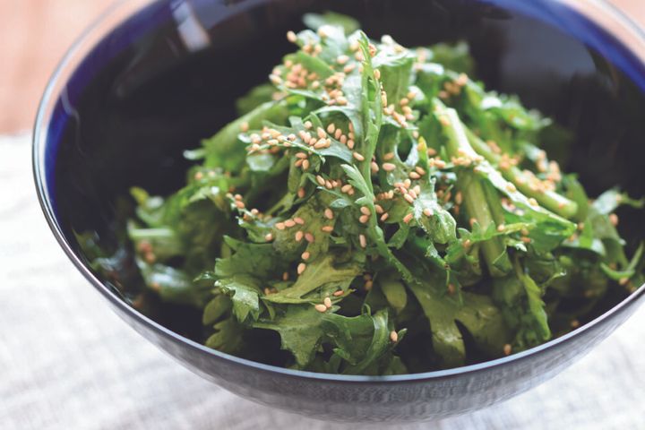 復活させた春菊1/2わはペーパータオルで水けを拭く。ボールに入れ、ごま油大さじ1と1/2、酢大さじ1/2、鶏ガラスープの素(顆粒)小さじ1/4を入れて、あえる。器に盛り、白いりごま適宜をふる。