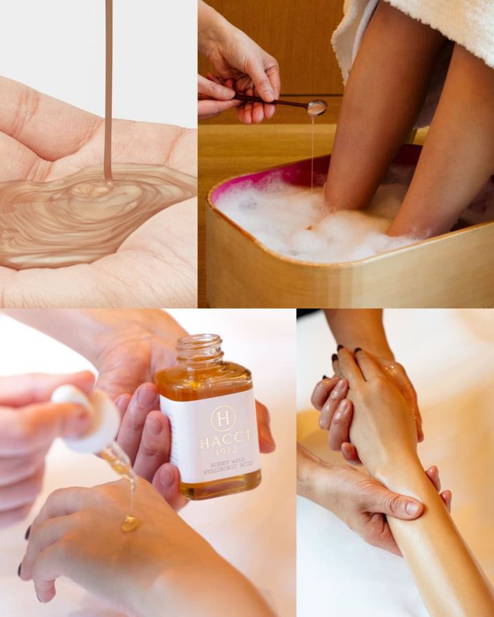 カカオとはちみつの甘い香りに包まれるフットバスの後、ビューティハニー配合のオイルで、デコルテや肩・腕、または脚を丁寧にケア。リッチな保湿と心地よいハンドタッチが、肌をなめらかに整えます。