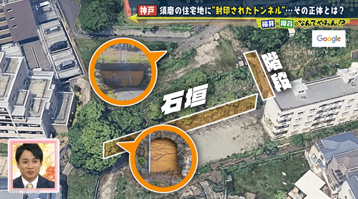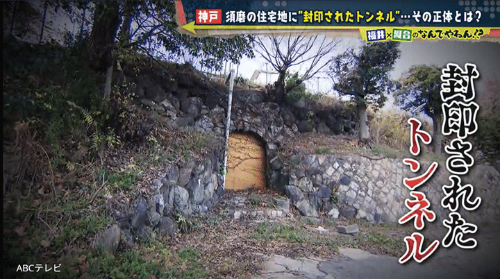 “封印されたトンネル”は、3メートルほどの高さ。周囲を石垣で囲まれ、閉ざされた部分には蔦が這っている。これをABCテレビの福井治人アナウンサーは「鉄道の開通により不要になった歩行者用トンネル」、タレントの河合郁人は「この石垣自体が何らかの施設でトンネルはその一部」と予想した。