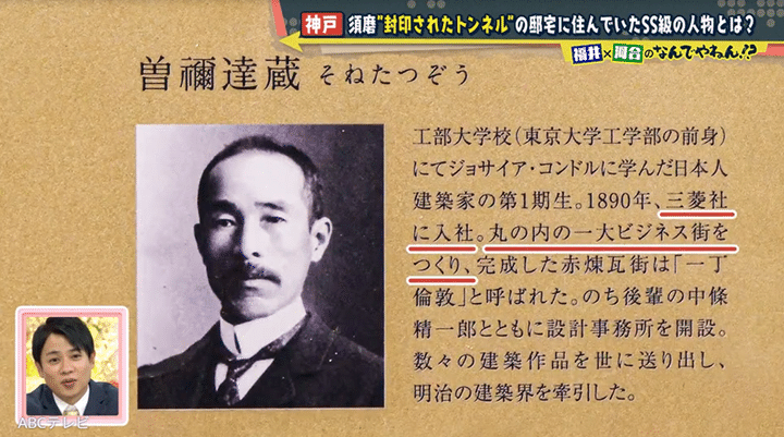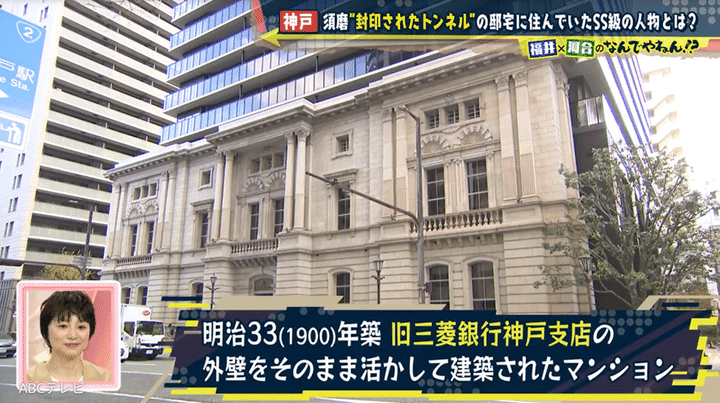 ハーバーロード到着早々に福井アナと河合は、立派なタワーマンションに着目した。このマンションの外壁は、明治33年建築の旧三菱銀行神戸支店のものをそのまま活かしている。設計を手がけたのは、洋風近代建築の重鎮・曽禰達蔵(そねたつぞう)氏だ。彼が三菱に入社した経歴があることから河合は、「あの場所に自分の家をつくっていて、その後に三菱の寮(社宅)にしたってなったら、めちゃめちゃつながる」と考えた。