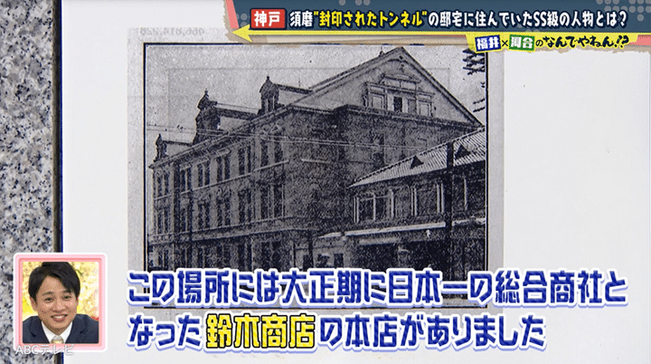 その近くで福井アナと河合は、鈴木商店本店跡地の石碑を発見した。説明文によると鈴木商店は、「大正期に日本一の総合商社となった」「総合商社の源流にして我が国産業革命の源泉」。その女主人・鈴木よね氏は、「次々に製造業を起業し、日本の貿易立国の礎となり、神戸港および神戸の産業発展に貢献」したという。