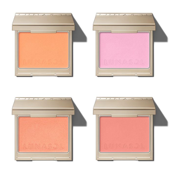 ルナソルのパウダーチークは、軽やかに広がり、肌の美しい血色感を引き立てるのが特徴。「02 サンキスト ブリス」は、太陽の恵みを感じさせる、フレッシュで軽やかなオレンジ。「03 ペタル ワルツ」は、舞い散る花弁のような ラベンダーが肌の透明感を引き出す。「04 ホライズン グロウ」は、ゴールドのツヤをたたえた オレンジベージュがヘルシーな印象。「05 ローズ セレニティ」は、やわらかなローズが静かな血色感を演出。