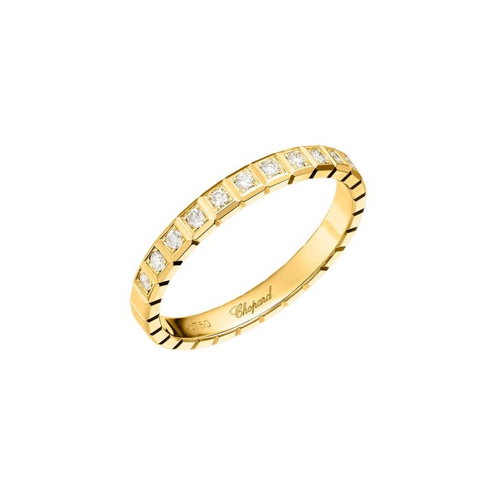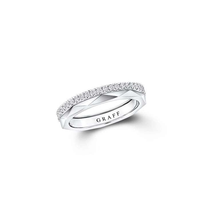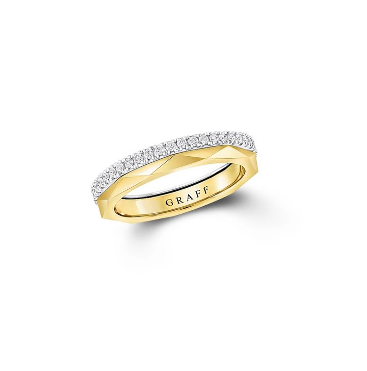 ダイヤモンドの多面的なファセットにインスパイアされたイエローゴールドのバンドと、パヴェダイヤモンドのエタニティを組み合わせたスタイリッシュなアイテム。