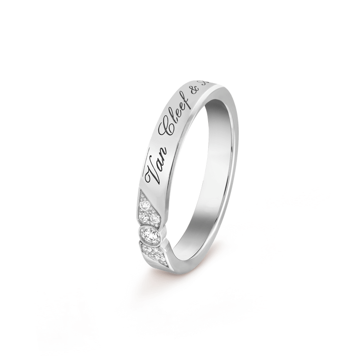 アルフレッド・ヴァン クリーフとエステル・アーペルの結婚から生まれたメゾンの名前が、筆記体で美しく刻まれたロマンティックなリング。