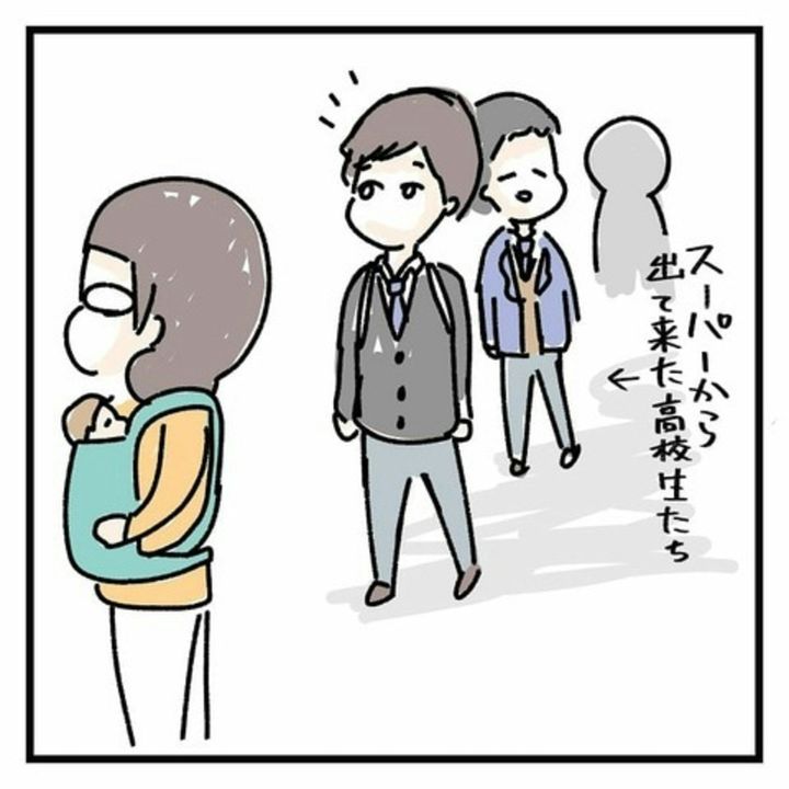 抱っこひもからひょっこりな赤ちゃんを見かけた高校生は「かわいー」とひと言。周りにお花が飛んでいるように見えるほどの、温かい反応が素敵!友人にも知らせて2人で癒やされている姿にこちらもほっこり。「あなた達も超かわいいよ!」と魚田さんが思うのも無理はありません。