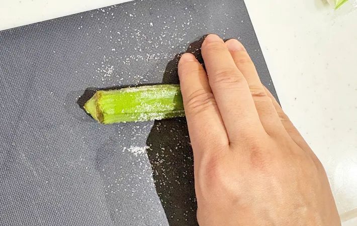 オクラは、軽く塩を振ってまな板の上で転がし、流水で洗っておいてください。
