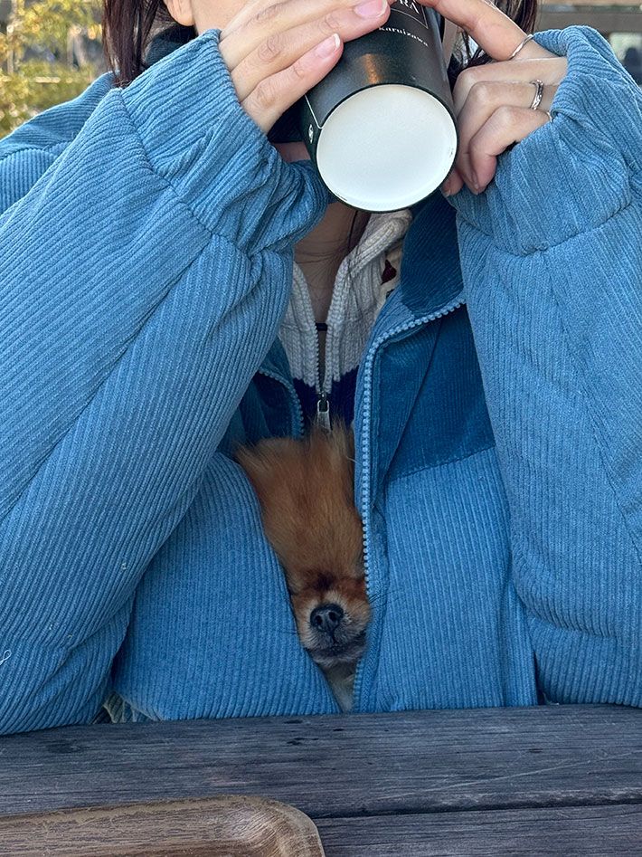 犬用のフリースやダウンを着せてもまだ寒そうだったため、飼い主さんがアウターの中に入れてみたところ、すっかりリラックスしていたそうです。