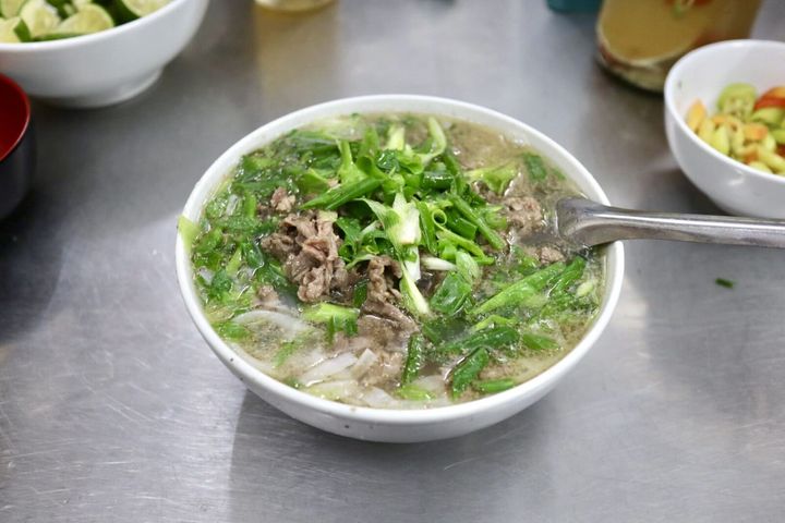 大量にフォーを調理している鍋を通り過ぎて空いた席に腰を下ろすと、まもなく出来立てのフォーが運ばれてきました。まずはスープをひとくち。牛肉の旨味が溶け込んだ出汁が、目覚めたばかりの身体に、じんわりと染み渡ります。やさしい喉越しの米粉麺はするっと食べられるあっさりさ。