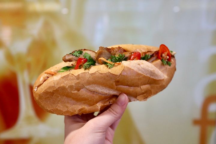 照り焼きやプルコギなど、どこか馴染みのある名前が並ぶメニュー。注文後、ひとつひとつ丁寧に温めてくれました。あたたかいバインミーは、両手でやっと持てるほどの大きさ。サクサクのパンに、チキンとピーマンやきゅうりなどの野菜がたっぷり。