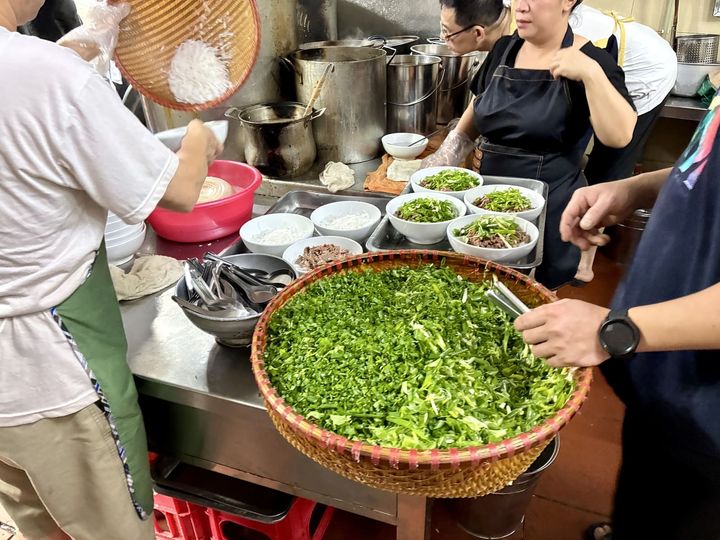 朝早く訪れたフォーの名店は、すでに満席。地元のお客さんであふれていました。外で注文し、席が空くのを待ちます。「No, パクチー?」と聞いてくれるので、パクチーが苦手な方も安心です。
