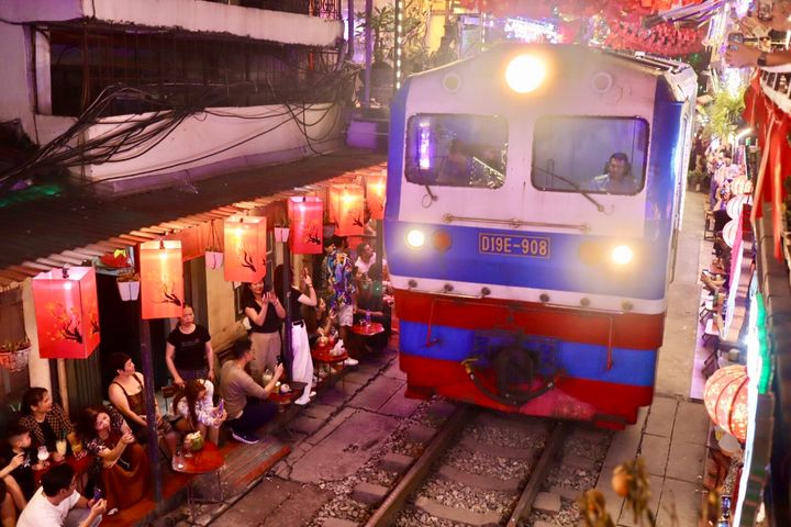 ハノイの観光名所のひとつ、「トレインストリート」。線路沿いに飲食店がずらりと並びます。夜にはきらびやかにお店がライトアップされ、街もにぎやかです。