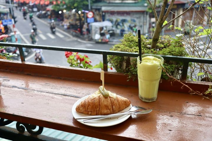 ドリンクは、もったりとアボカドの濃厚さを残しつつ、すっきりとした甘さで飲みやすいアボカドスムージーをいただきました。テラス席でハノイの朝を眺めながら、日常の中に溶け込んだような人々の生活をのぞいているような時間を過ごしました。
