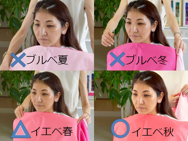 実際、私の顔に4タイプの色を当てていくと、青みがかった肌色(ブルーベース=ブルべ)である「夏」のカラーは不健康に見えますし、「冬」のカラーは顔がキツくハデな印象に見えました。