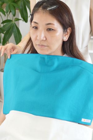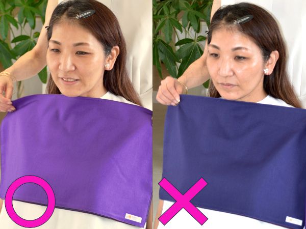 その後、鏡の前でさまざまな色のカラードレープを顔の近くに当てていくと、ライティングは同じなのに、ドレープの色によって顔色が異なって見えるのがわかります。色によって人に与えるイメージが変わるのが一目瞭然です。