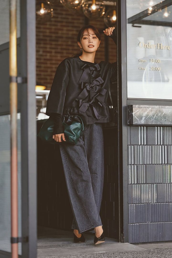 ビッグリボンが目を引く華やかトップスも、デニムを合わせればぐっとトライしやすい着こなしに。ツヤのある素材感が甘さをクールに引き締め、主張のあるデザインも程よくなじみます。