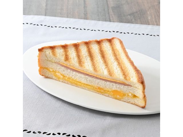 3枚の食パンにハム・チーズ・たまごサラダをサンドし、ハーフカットして焼き上げた、ボリュームのある惣菜パンです。