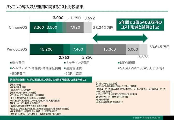 ビジネスシーンでのPC選びにおいて、WindowsとChromebookの比較が注目されています。MM総研による調査によると、Chromebook1,000台を5年間運用する想定での試算では、Windowsと比較して約2.5億円の費用削減が可能とのこと。また、導入や運用にかかる作業時間についても、Windowsが3,153時間なのに対し、Chromebookは65時間と、驚異的な削減率となる実態が明らかになりました。