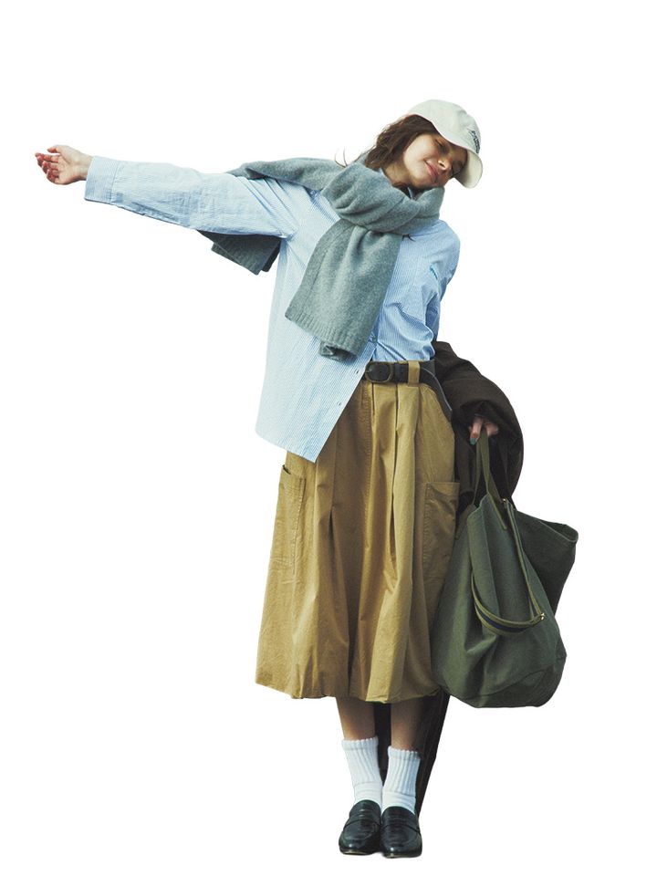 【POINT】シャツ、ローファー、白靴下の紳士な組み合わせには、ワーク感のあるスカートで鮮度をアップ。視線を上げるようにストールを首に巻き、スタイルアップも抜かりなく。