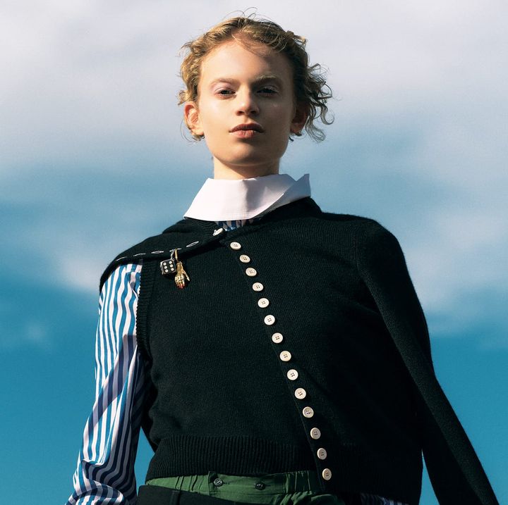 今季のシャツは、オーセンティックなデザインからデコラティブな進化形までバリエーションの振り幅が広がっている。アシンメトリーなシャツは、フォルムを強調するIラインのボトムと合わせるのが理想。’90年代風のミニスカートで潔く。