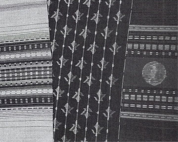右は文章中にある帯で、阿仙の茶に蘇芳の赤の配色。絵絣で鳥がみごとに表された作品。中は藍地に小花を抽象化した絣を織った着物。左の帯は桜のピンク。 撮影=大倉舜二