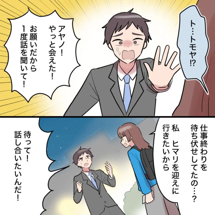 声の主はトモヤでした。「アヤノ!やっと会えた!お願いだから一度話を聞いて」必死な表情で私を引き止めようとします。「仕事終わりを待ち伏せしてたの?私、ヒマリを迎えに行きたいから」そう言って立ち去ろうとした瞬間、トモヤは行く手を阻むように立ちはだかり、「待って!話し合いたいんだ!」と声を荒げました。