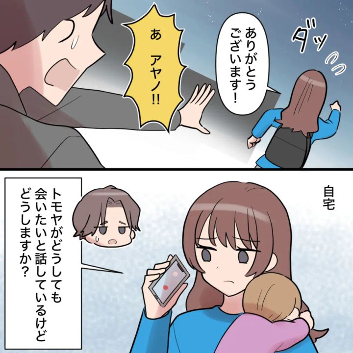 計画は3人に気付かれることなく進行し、ナオキさんは家の売却、私は経済的自立を果たすことに成功。けれど、トモヤの実家を出てしばらく経ったある日。仕事帰りに保育園へヒマリを迎えに行こうと足早に歩いていると、背後から「アヤノ!」と呼び止められました。