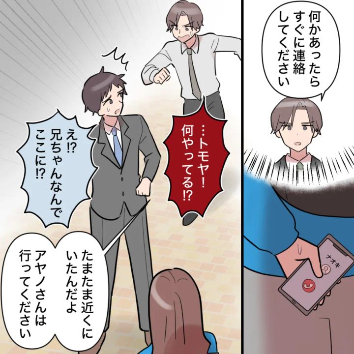 その時、「何かあったらすぐに連絡してください」というナオキさんの言葉が脳裏に浮かび、私は迷わずスマホを取り出して電話をかけました。「トモヤ!何やってる!?」突然現れた兄の姿に驚いたのか、トモヤは動揺した様子で「兄ちゃん、なんでここに!?」と声を上げました。「たまたま近くにいたんだよ、アヤノさんは行ってください」ナオキさんはトモヤの肩をしっかり掴むと、そう言って私をその場から逃がしてくれたのでした。