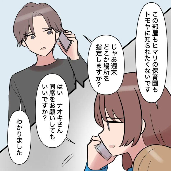 「この部屋もヒマリの保育園もトモヤに知られたくないです」私がそう言うと、ナオキさんは気を遣って「じゃあ週末、どこか場所を指定しますか?」と言いました。1人だと不安だった私は、ナオキさんに同席をお願いして、電話を切りました。
