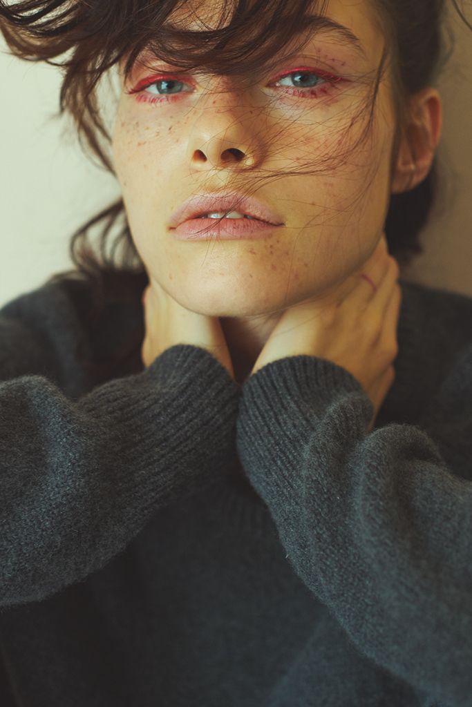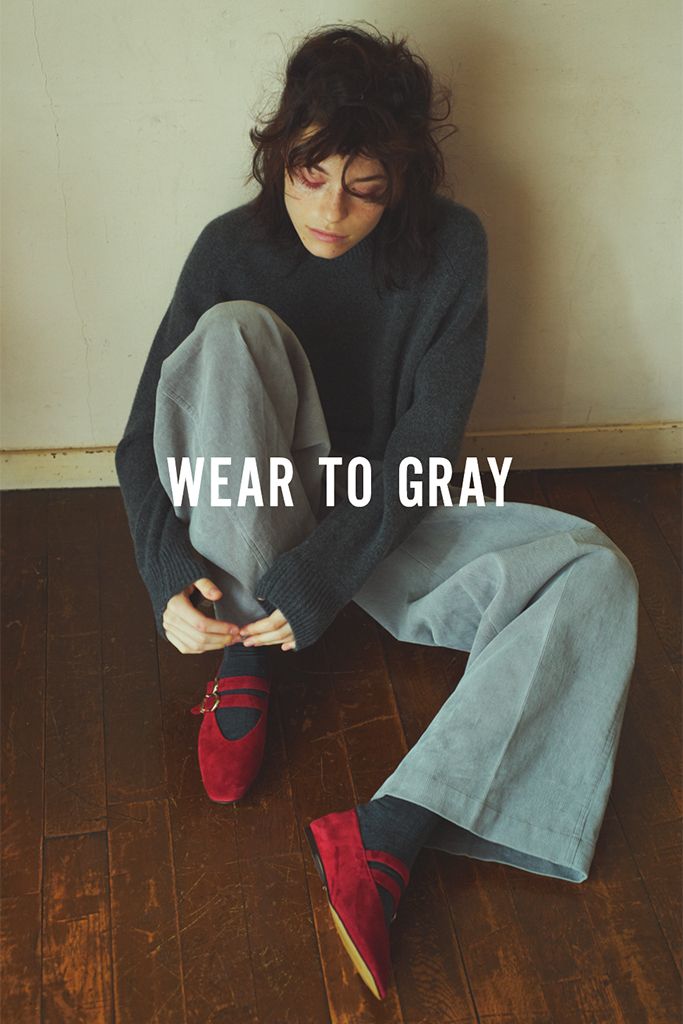 「何もしない」ままでは少々楽しみがない、ニュートラルなグレーのニットは「メイクで遊び」を。太めのアイライナーとバサバサまつ毛。赤でつくるレトロな目元をポイントに。靴でも赤をリンクさせて、バランス良くグレートーンにアクセントを。
