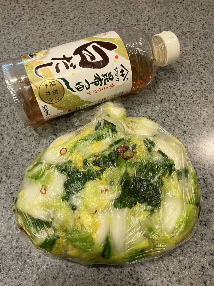 塩で揉んで水気を絞り、味付けをしたら冷蔵庫で一晩寝かせて完成。自宅でも十分にできそうですね!漬物石や、長時間漬け込むことが必要だと思っていたので驚きました。お漬物があると箸休めにも助かります。