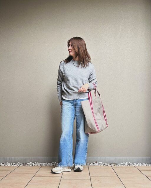近所でお買い物する休日のデニムコーデには、カラーハンドルが可愛いグレーのトートバッグがぴったり。スニーカーとニットもグレーでまとめれば、カジュアルだけれど上品さ漂うコーデに仕上がります。パールネックレスを合わせて顔周りに品のよさをプラスすると素敵。