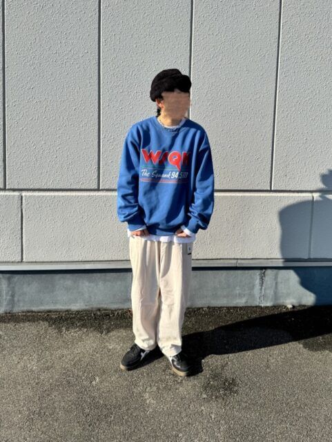 こちらは爽やかなブルーにレッドのロゴが映えてコーデのポイントになるロゴスウェット。こんなきれい色のロゴスウェットを着るときは、スウェット以外をシンプルな配色でまとめると好バランスです。白のパンツを合わせて爽やかな配色に仕上げると、抜け感の漂うコーデに。