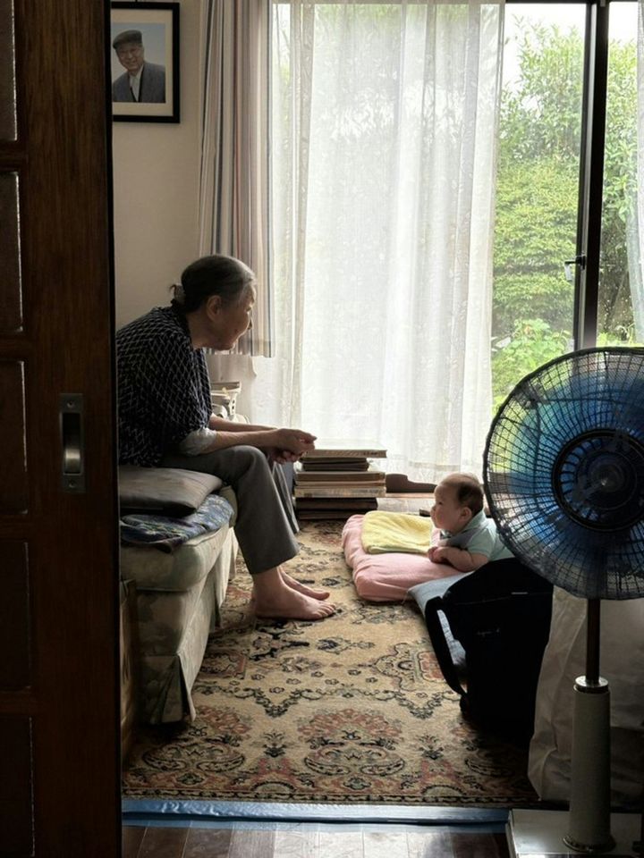 ひ孫を見つめる祖母と、それを見守る亡き祖父。