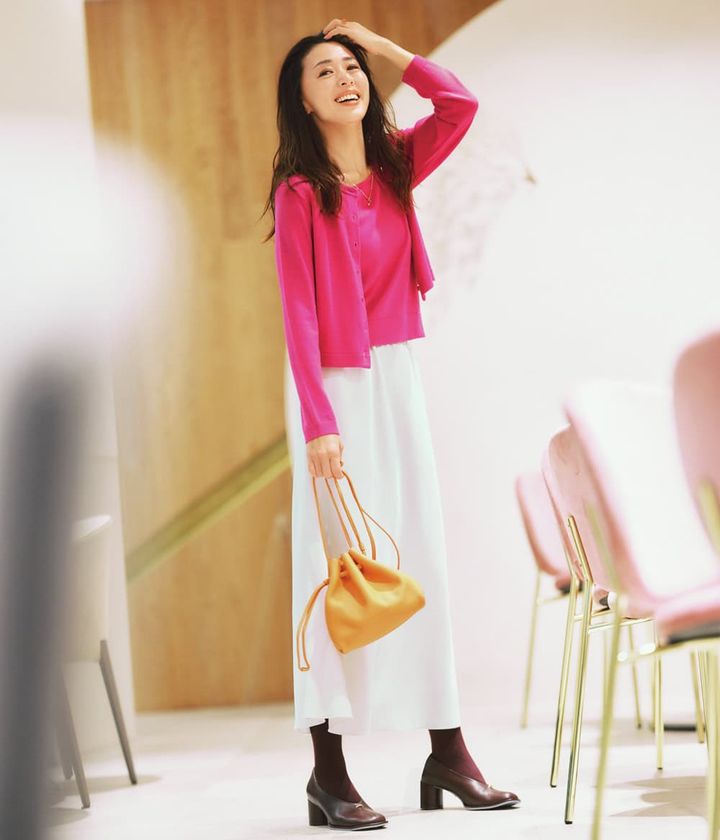 マゼンタニットカーディガン¥28,600ニット¥23,100(ともにルル・ウィルビー/アルアバイル)スカート¥42,900(DES PRÉS/DES PRÉS)オレンジバッグ¥88,000(ボナベンチュラ)7ペンダントトップ¥111,100ネックレスチェーン¥375,100(ともにNo./ナンバードット)パンプス¥19,800(ル タロン グリーズ/ル タロン グリーズ ルミネ新宿店)オレンジリング¥176,000パールリング¥178,200(ともにマリハ)タイツ/スタイリスト私物