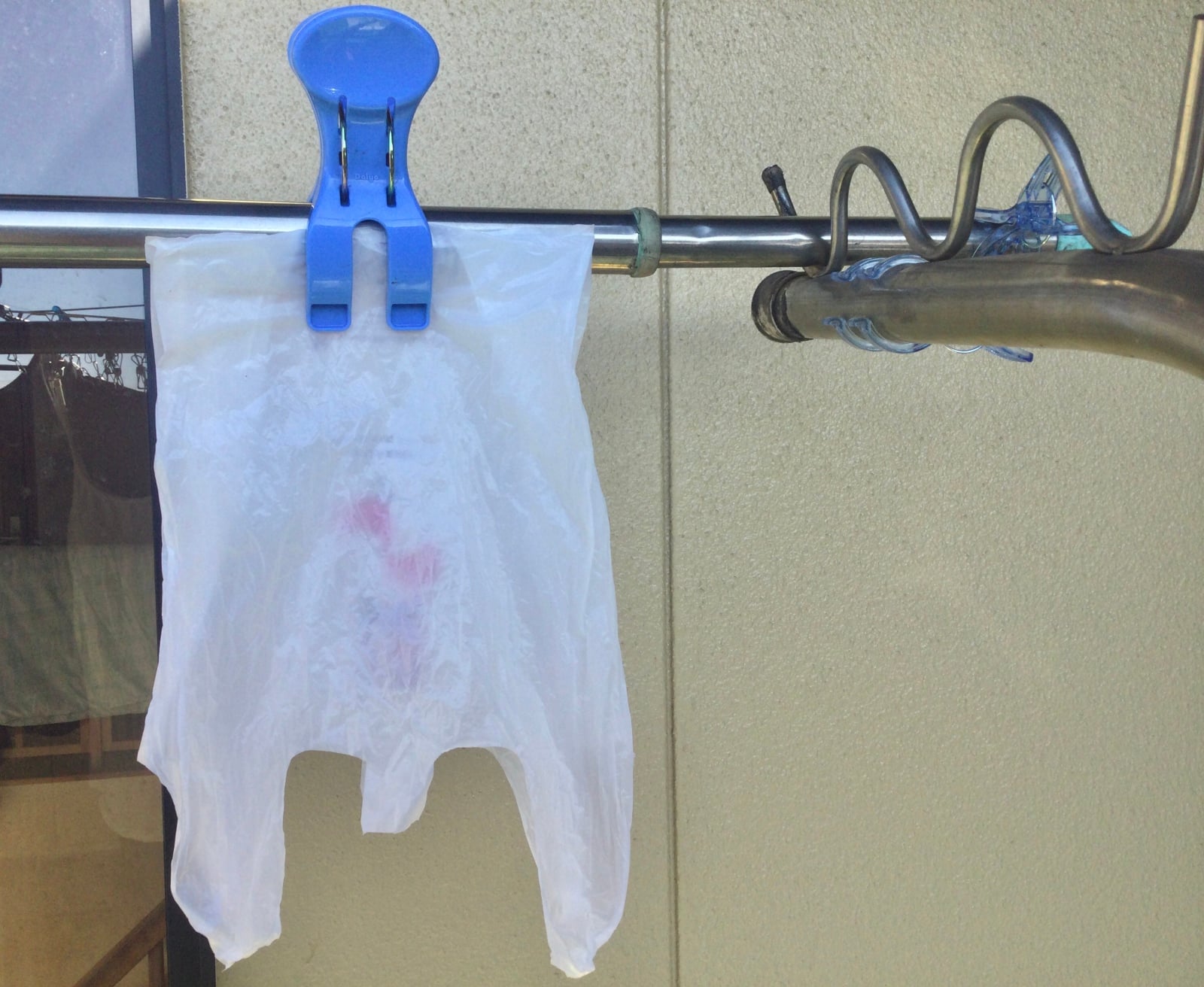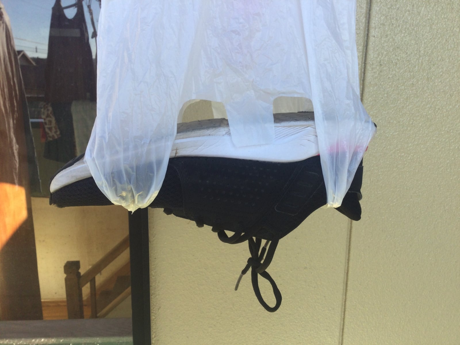 ビニール袋を逆さまにして物干し竿にかけます。靴の重みでビニール袋が落ちないよう、洗濯バサミなどでしっかり固定しましょう。