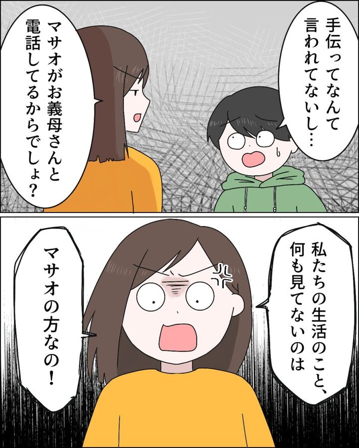 「手伝ってなんて言われてないし・・」と恐る恐る反論するマサオに、「マサオがお義母さんと電話してるからでしょ?」と言った後、「私たちの生活のこと、何も見てないのはマサオの方なの!」と言いながら怒りがこみ上げてきました。