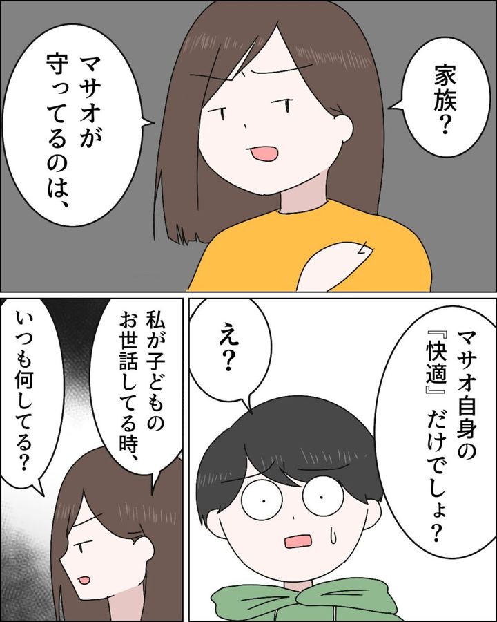 「家族?マサオが守ってるのは、マサオ自身の『快適』だけでしょ?」と言うと「え?」と驚いた表情を浮かべるマサオに、「私が子どものお世話してる時、いつも何してる?」