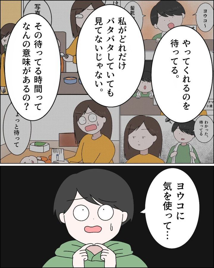 「やってくれるのを待ってる。私がどれだけバタバタしていても見てないじゃない。その待ってる時間ってなんの意味があるの?」マサオに、これまでずっと思っていたことを言うと、「ヨウコに気を使って・・」と言い出すマサオに、