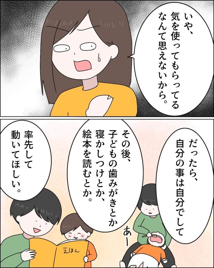 「いや、気を使ってもらってるなんて思えないから。だったら、自分の事は自分でして、その後、子どもの歯みがきとか寝かしつけとか、絵本を読むとか。率先して動いてほしい」マサオの無駄な待ち時間を有効活用する方法をひとつひとつ細かく伝えると、