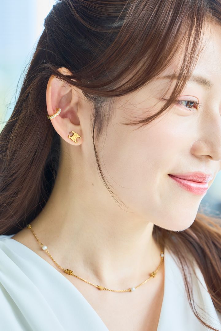 セリーヌのゴールドピアスとネックレスは、主張しすぎないサイズ感だから仕事の現場にもつけていけるし、華やかな女子会にもぴったり。ホワイトコーデに上品なアクセントを加えてくれます。最近一番出番が多いジュエリーです。