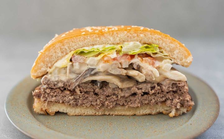 本商品は、期間限定で販売中の人気シリーズ「マッシュルームワッパー」の冬の新作です。直火焼きの100%ビーフパティと、まろやかなサワークリームとオニオンペーストの旨みに3種のハーブがほのかに香る「特製サワークリームオニオンソース」、きのこ、レタスなどを組み合わせた本格バーガーです。