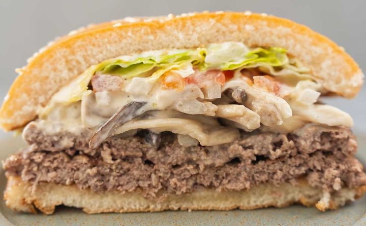 バンズのあいだには、100%ビーフパティ2枚と、ローストした2種類のマッシュルーム、エリンギ、ぶなしめじの4種のきのこ、レタス、トマト、オニオン、特製サワークリームオニオンソース、マヨソースが入っています。